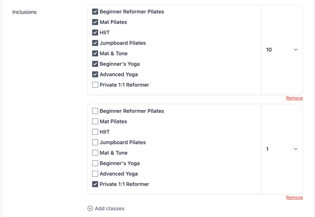 However, if you wanted to also include a private one-on-one reformer session to the pack in addition to the 10 classes, but restricting bookings of that class type to a single class, you would then add an additional group of inclusions, tick only the ‘Private 1:1 Reformer’ class type, and set the quantity to 1.