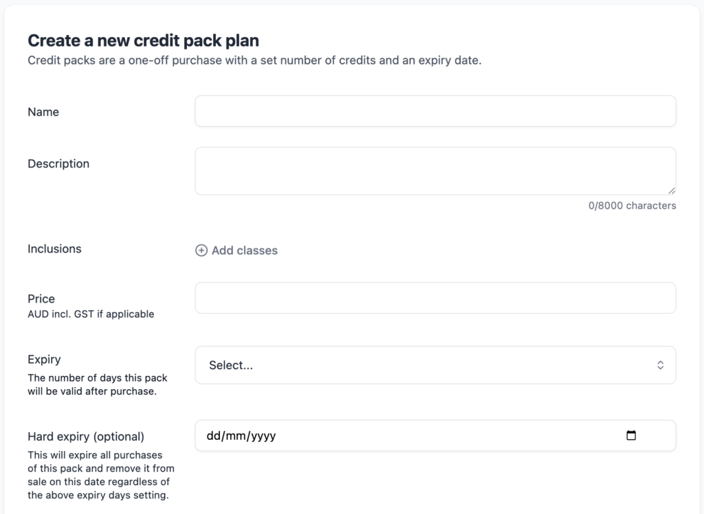 You can optionally set a hard expiry date. This gives you an option to expire all credit packs of this type on a given date, rather than a relative number of days from the purchase date. This is a great option for special deals such as opening specials. If you set hard expiry, the pack will also be removed from sale on the expiry date, in addition to all purchases being expired.