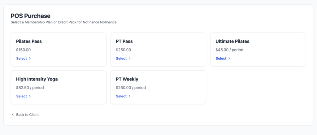 Choose the pack or plan the client wishes to purchase or sign-up to respectively.