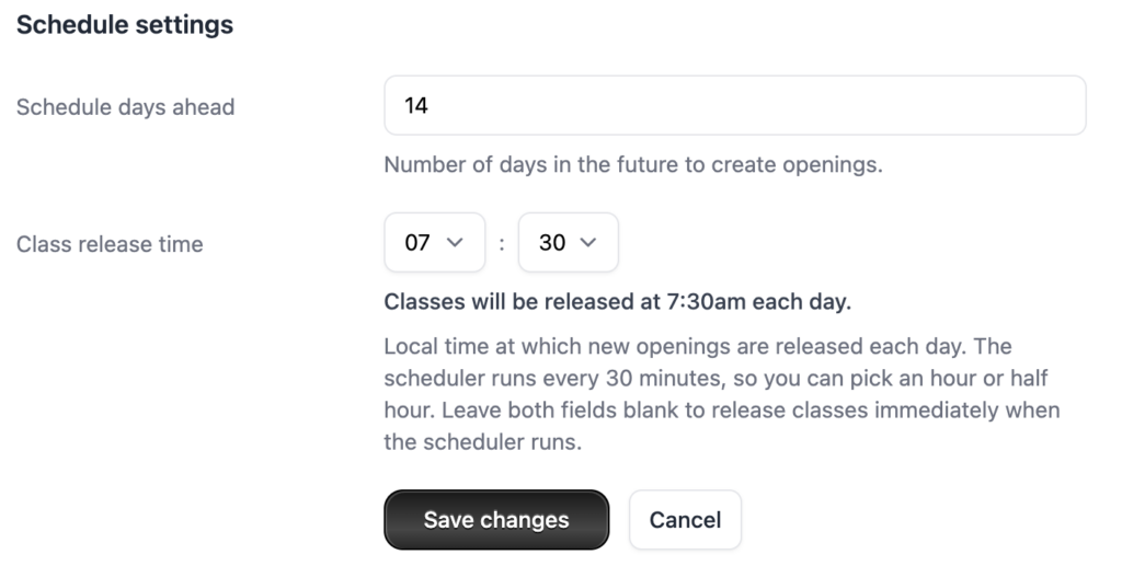 When you set a release time, the scheduler holds off on releasing the next day’s batch of openings until your chosen time. So if you’ve set your release time to 7:00am, your clients won’t see new openings appear until after 7:00am each day in your studio’s local timezone.